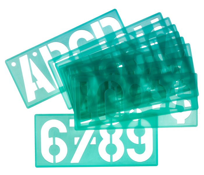 Sjablong med store bokstaver, tall og symboler. Til bruk hjemme, i skolen og på arbeidet. En lett og hurtig måte å skrive bokstaver til arkivering, skilt og mange andre formål. tusjkantene forhindrer at fargen gnis ut. 100 mm skrifthøyde. Materiale: grønntransparent PP.